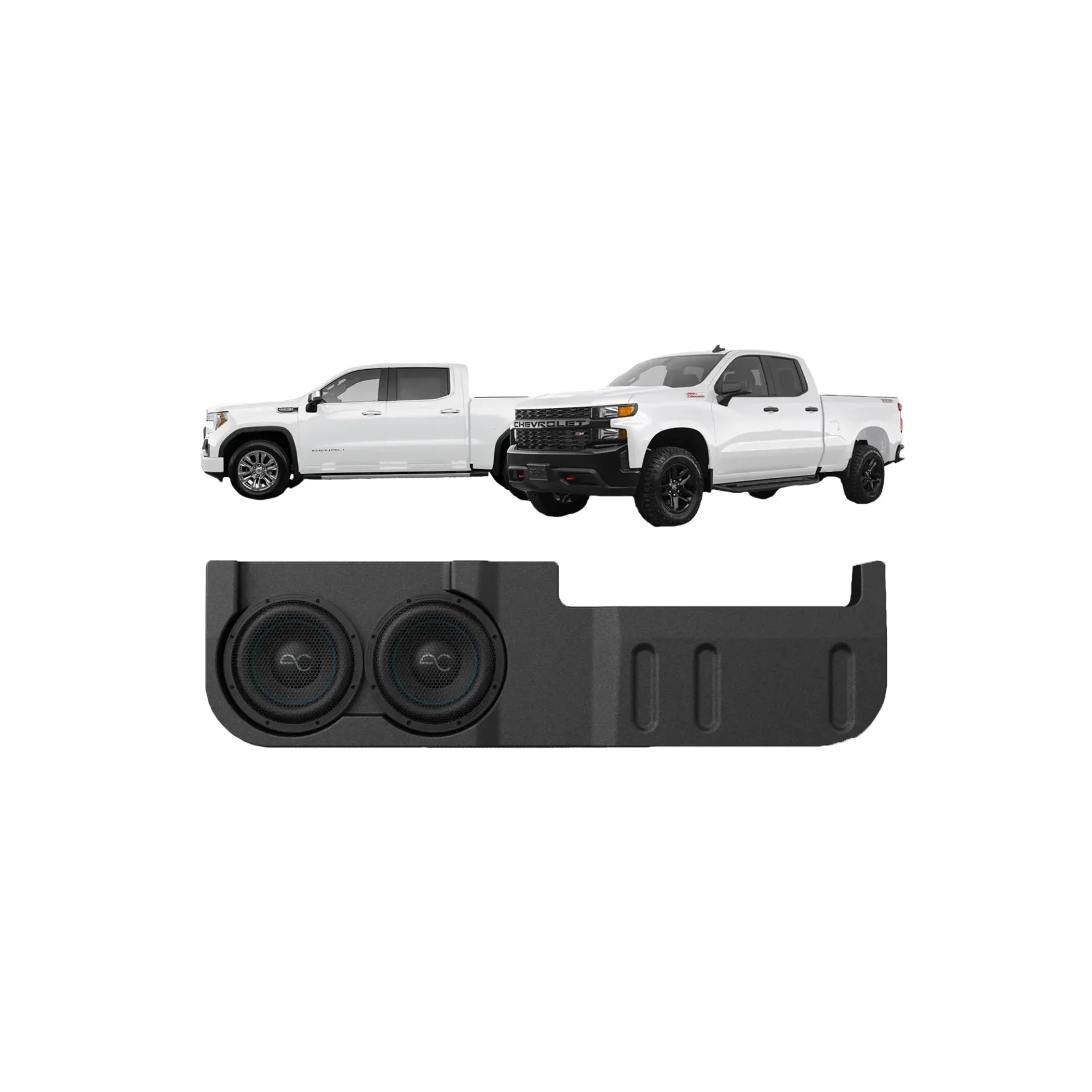 Designed to fit perfectly beneath the rear seat of your Chevy Silverado or GMC Sierra, our Dual 10” Vented Subwoofer Enclosure provides a powerful and effortless upgrade to your audio system with high-performance AudioControl Spike Series subwoofers. This enclosure is crafted from durable fiberglass and engineered to endure rough conditions while maintaining rugged, weather-resistant protection, ensuring long-lasting performance and exceptional sound quality on every drive.