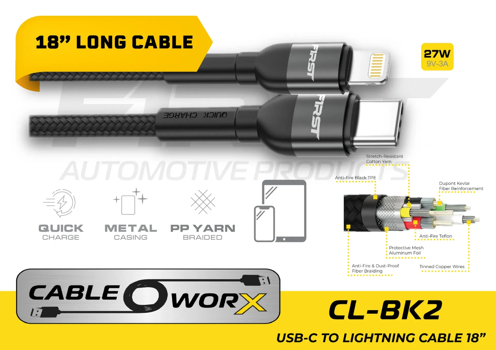 This high-quality USB-C to Lightning cable offers superior data sync and charging capabilities, thanks to its premium design. The CL-BK1 is 18 INCHES in length, with reinforced metal ends and a hybrid Kevlar outer jacket. It boasts a durable design to prevent breakage. Stay connected and charged with confidence.